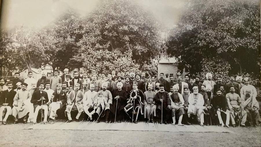 (Group Photograph of Rai Bahadur Lala. Sheo Pershad seated in the centre in front row in black achkan with white turban & holding a ceremonial sword at Delhi Darbar in 1911)
