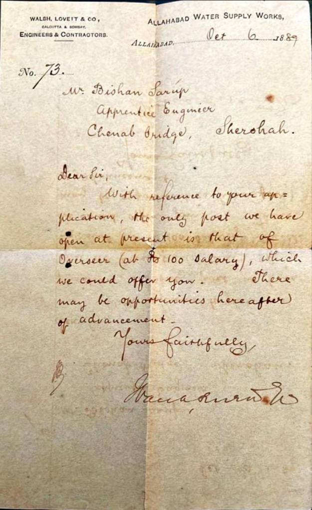 Masterji educated his eldest Son Lala. Bishan Sarup in civil engineering in the year 1887 from Roorkee who joined his cloth business firm in 1890s as the Managing Partner, with his rich practical experience of working as an engineer on mega project of Chenab Bridge, Shershah, Kashmir in 1889 and other Mega Construction Projects ,which shaped modern India, played an important role in the preparation of the detailed project report with respect to plant layout and later with the construction of Delhi Cloth & General Mills (“Putli Ghar”). Lala. Bishan Sarup ji also supervised the construction of Pilli Kothi , Delhi (the first multi storey building constructed in Delhi in the year 1911) which in deep global recession which followed the First World War 1914-18 was sold to British Railways in 1921 at a great loss.